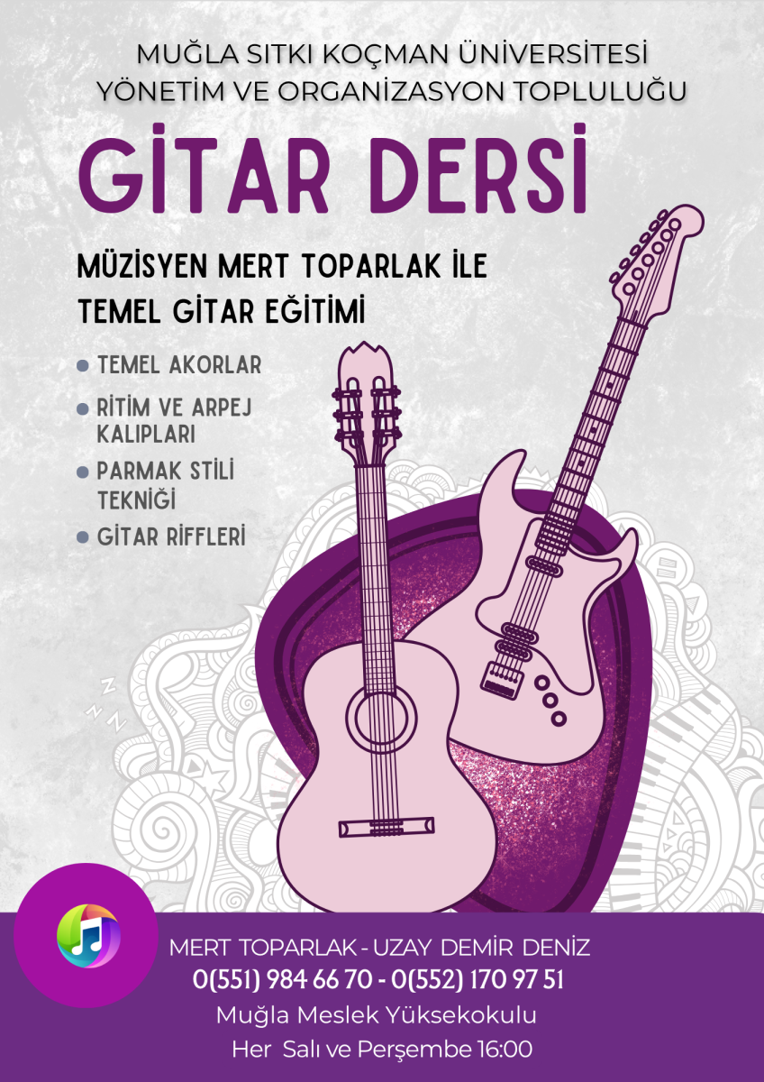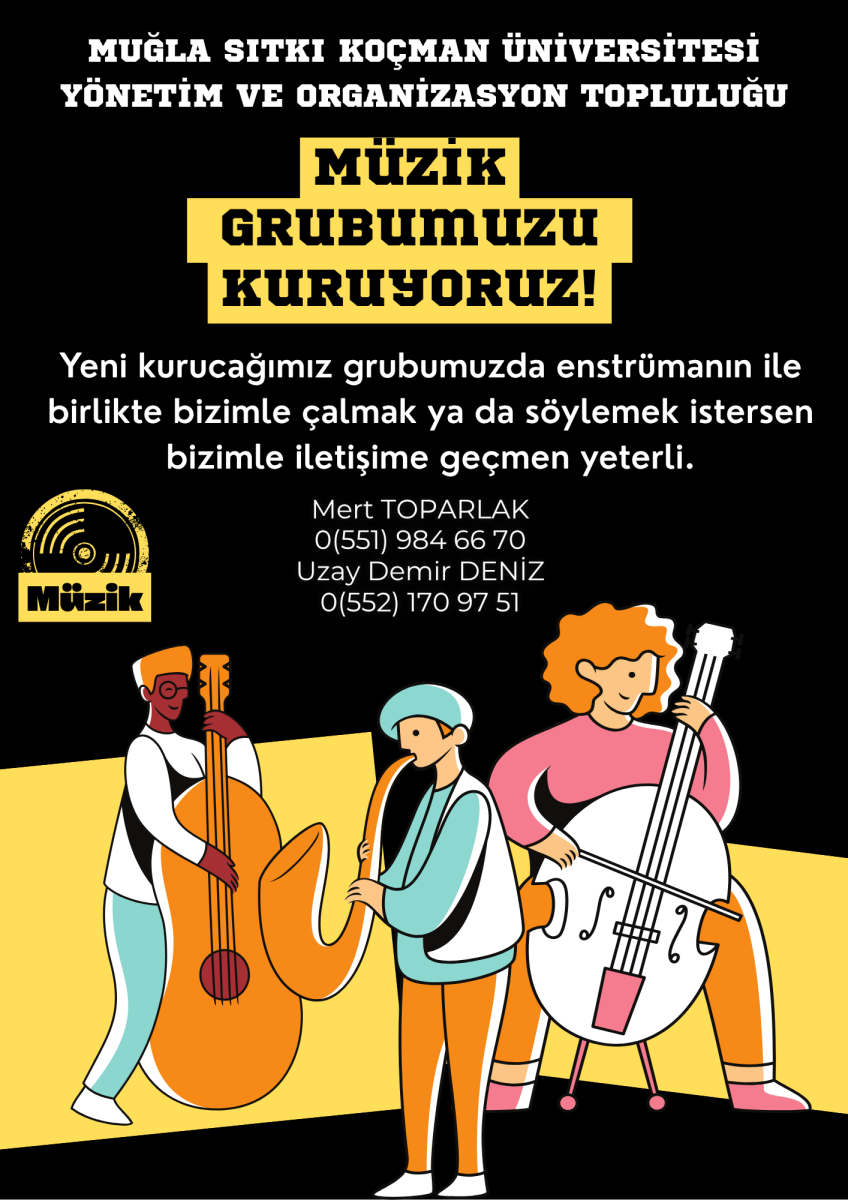 Yönetim ve Organizasyon Topluluğu tarafından yeni kurulacak olan müzik grubuna sesleri ya da enstrumanlarıyla eşlik etmek isteyen öğrenciler toplulukla ileitşime geçebilir. Ayrıca gitar dersi almak isteyen öğrenciler, eğitmen Mert Toparlak ile iletişime geçerek kursa dahil olabilir, her salı ve perşembe günü gerçekleştirilen derslere katılabilirler.